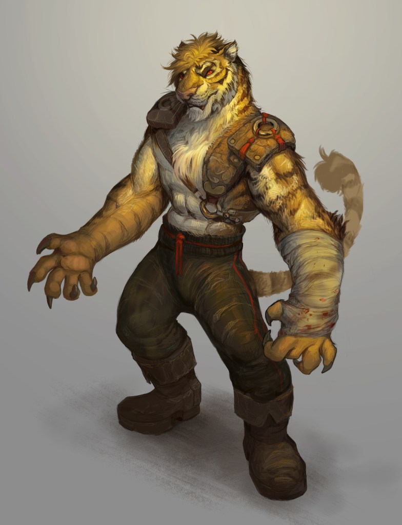 He is a Beastman (or Bestlia), a race of bipedal anthropomorphic species whom The Gods granted advanced evolution, allowing them to walk on their hind legs and higher intellect. Although, they are seen as second class citizens by the Eldar, Dwarves, and most ordinary folk as they are a bit primitive by nature. Many are still feared and recognized as top predators in the food chain.